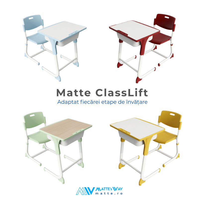 Matte ClassLift reprezintă noul standard în mobilier școlar ergonomic, fiind un set de masă și scaun școlar reglabil pe înălțime, proiectat pentru confort, siguranță și funcționalitate în clasele moderne. Dedicat elevilor din ciclul primar și gimnazial, Matte ClassLift este conceput să crească odată cu utilizatorul, datorită reglajelor multiple și intuitive.